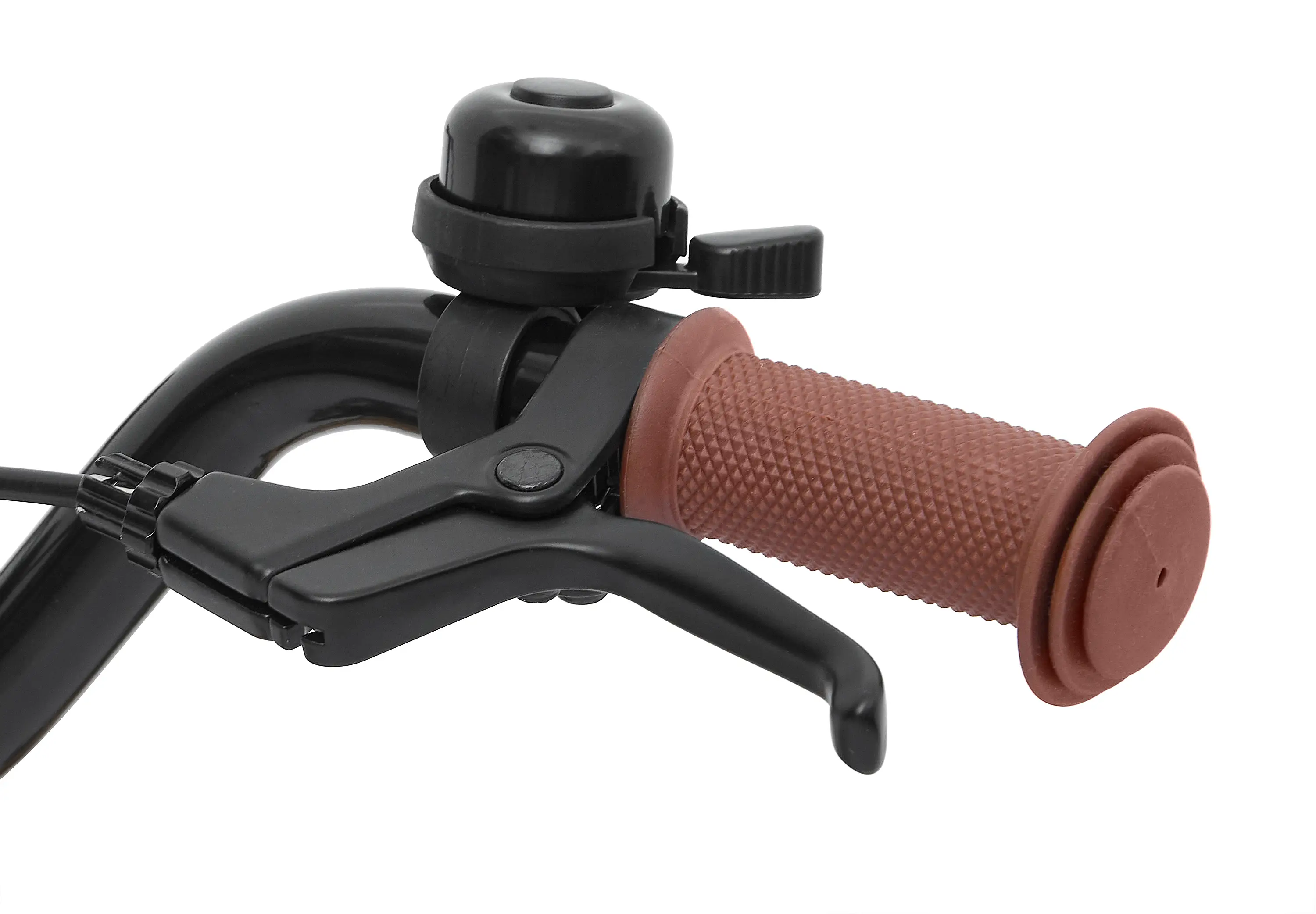 Зубастые покрышки с камерами, которые можно накачать обычным автонасосом, подходят и для асфальта, и для грунтовых парковых тропинок. А чтобы юный велосипедист был заметнее на дороге, мы включили в комплект катафоты и звонок, а на раму нанесли светоотражающие надписи.