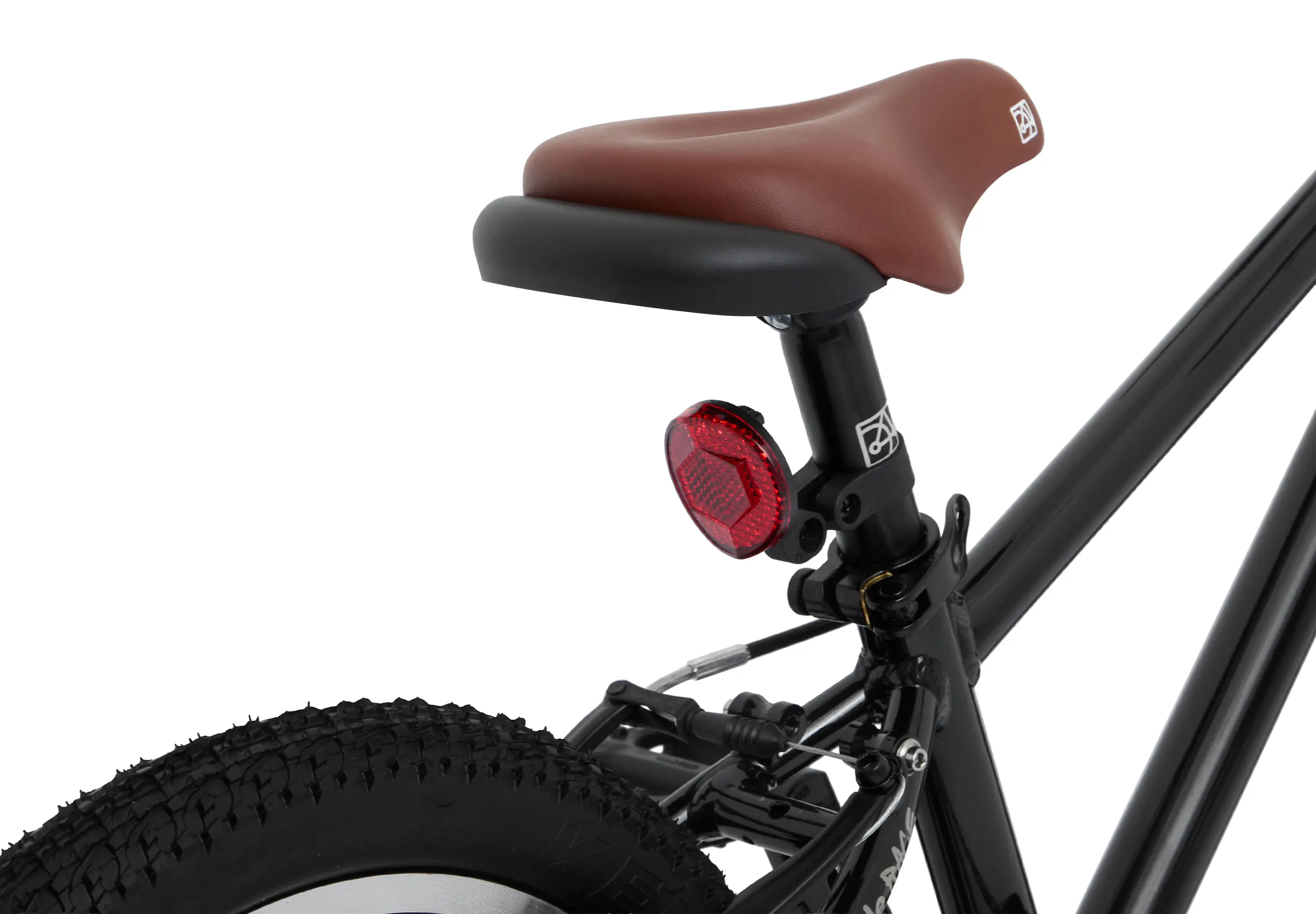 У сиденья есть специальная ручка: за нее родители могут поддерживать малыша, пока он катается неуверенно. Зубастые покрышки можно накачать обычным автонасосом и ездить как по асфальту, так и по грунтовым дорожкам парка. В комплекте звонок и катафоты, а на раме — светоотражающие надписи, чтобы юный велосипедист был заметнее на дороге.