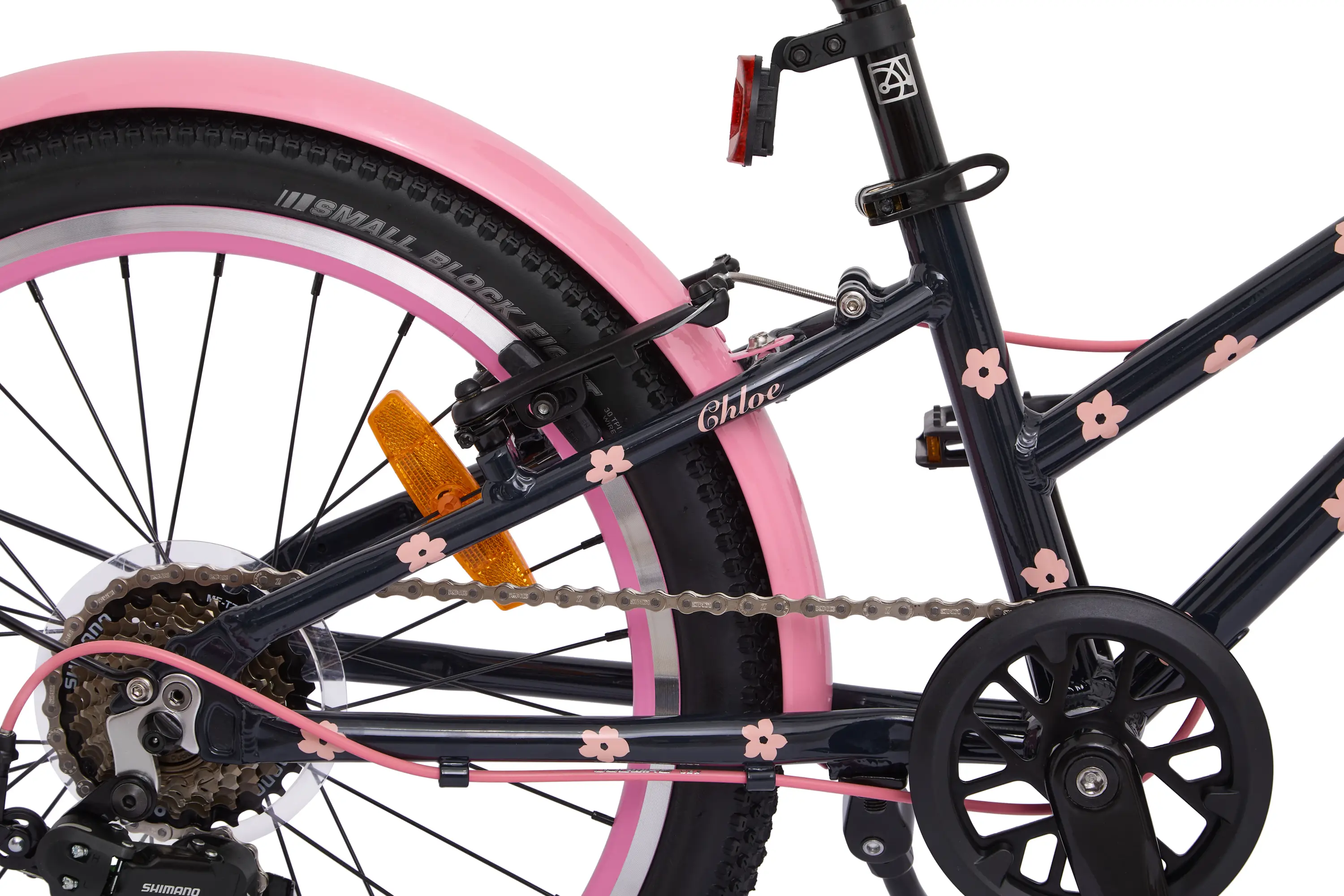У Chloe 20 Race ободные тормоза V-brake, как на «старших» моделях, но ручки адаптированы под пальцы ребенка. Велосипед весит всего 8,3 кг, так что юный райдер сможет сам перенести его через препятствие или по лестнице.