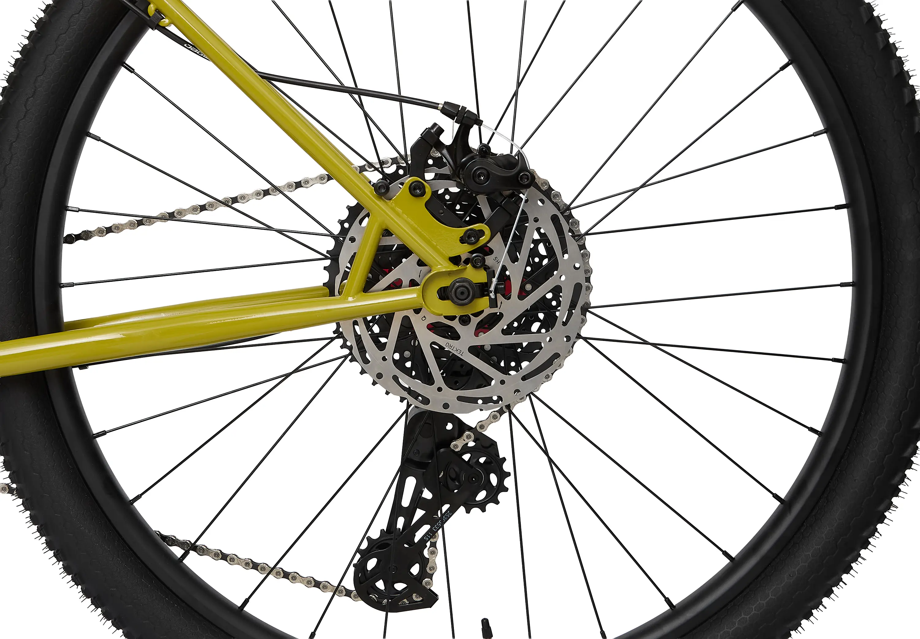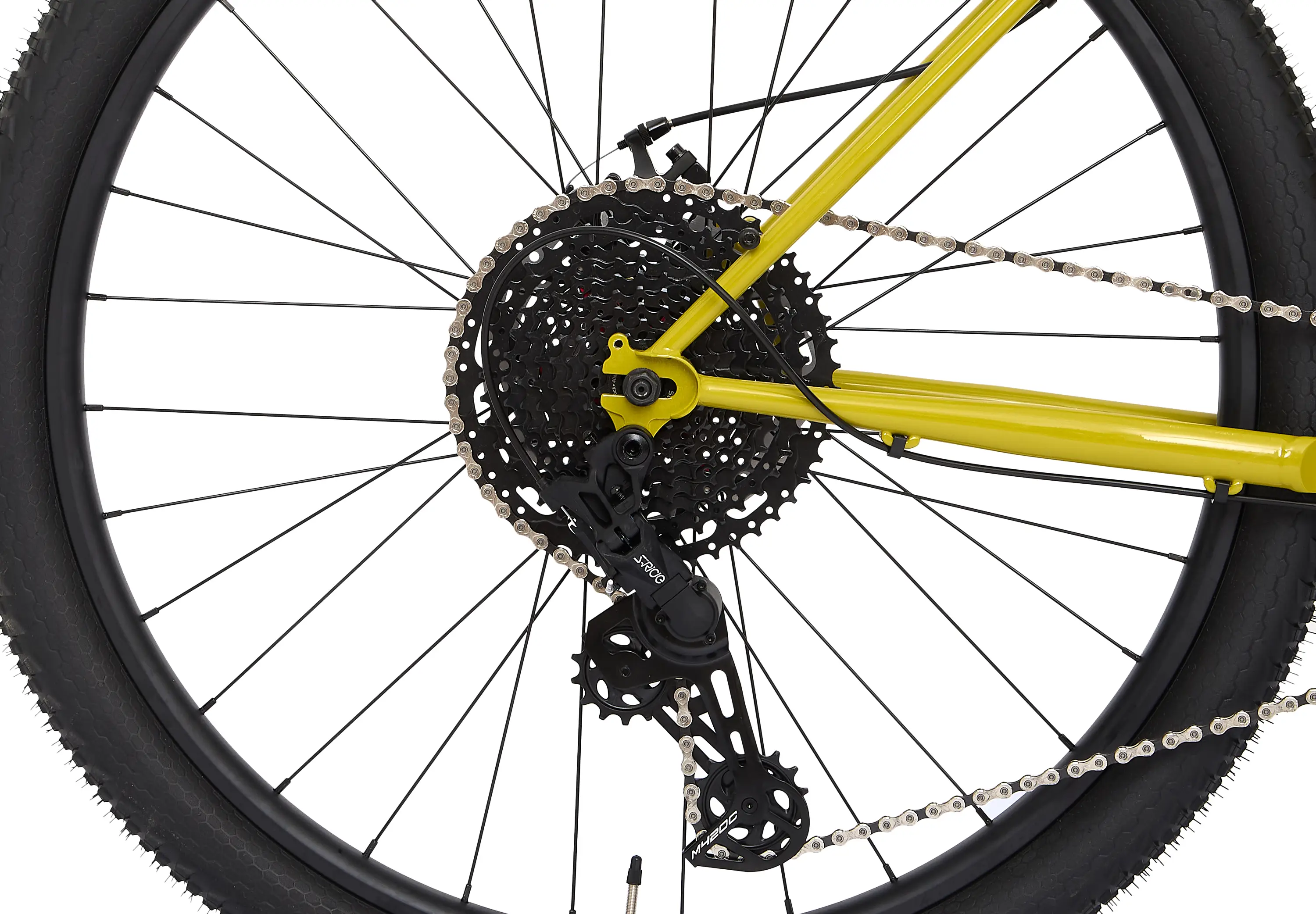 Рама и вилка полностью хромомолибденовые. Рама из баттированных труб сделана под эксцентрики, оси 100 и 135 мм. У этой рамы 44 мм рулевой стакан, в нее можно поставить любую амортизационную вилку с конусным штоком, и ход 130 мм — это верхний край, верхняя граница. Трансмиссия на велике 1 на 9 компании Microshift, выбрали именно ее, потому что в этой ценовой категории эта трансмиссия с самым большим диапазоном кассеты. Здесь 9 скоростей, 11 на 42. Особенность рамы — горизонтальные дропауты, это значит, что на этот велосипед можно поставить планетарную втулку, или его можно сделать синглспидом, если вы хотите себе повседневный rigid niner. На нем достаточно короткие задние перья, положение заднего колеса можно регулировать от 425 до 450 мм — это позволит лучше почувствовать свой велосипед: на коротких перьях он будет более юркий и управляемый, на длинных перьях он будет более медленный и стабильный. Разница в 22 мм — довольно большой диапазон настройки, и вы сможете почувствовать, как по-разному ведет себя велосипед с разным положением заднего колеса.