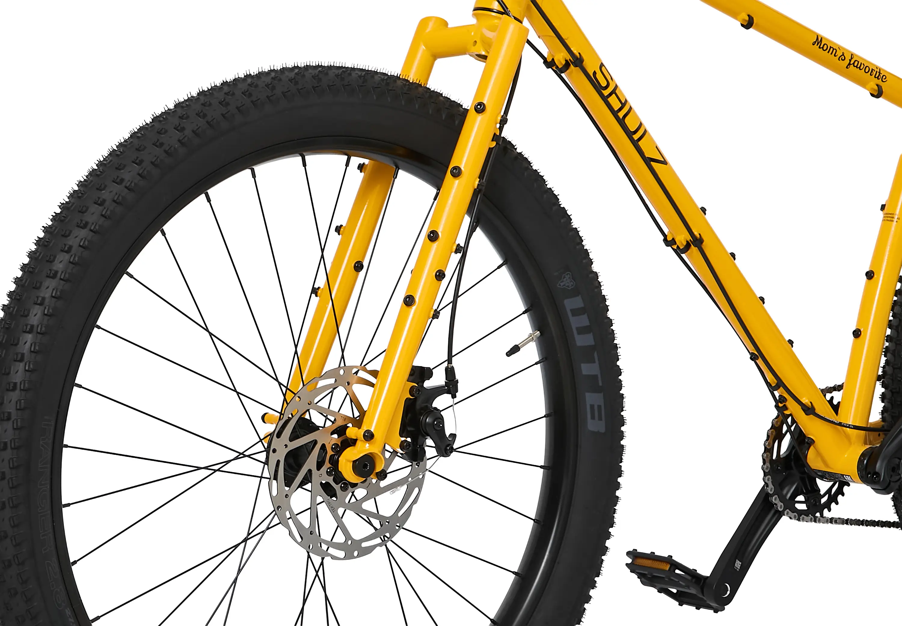 На Mom’s Favorite можно положиться: у велосипеда прочные хромомолибденовые вилка и рама с баттированными трубами, надежные механические дисковые тормоза и покрышки с широко расположенными шипами, которые подходят в том числе для бескамерной установки. Широкий руль с петлей позволяет менять положение рук, чтобы они не уставали при долгой езде.