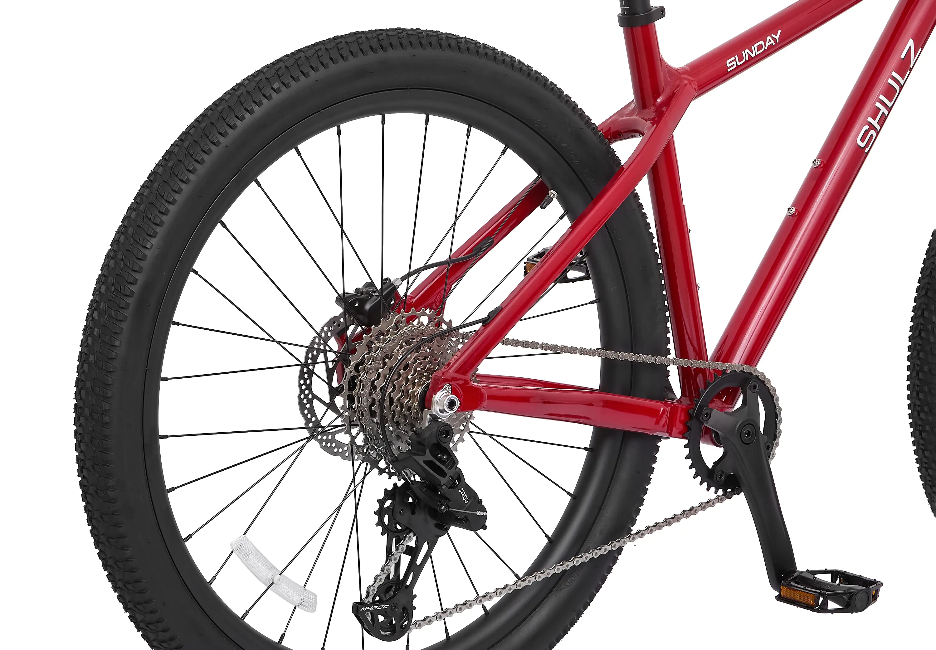Стильный горный 9-скоростной велосипед на осях с алюминиевой рамой, колесами 27.5″, амортизационной вилкой и гидравлическими тормозами. SHULZ Sunday создан для любителей и новичков, которые хотят получить удовольствие от велопрогулки по лесу, минуя сложные горные маршруты.