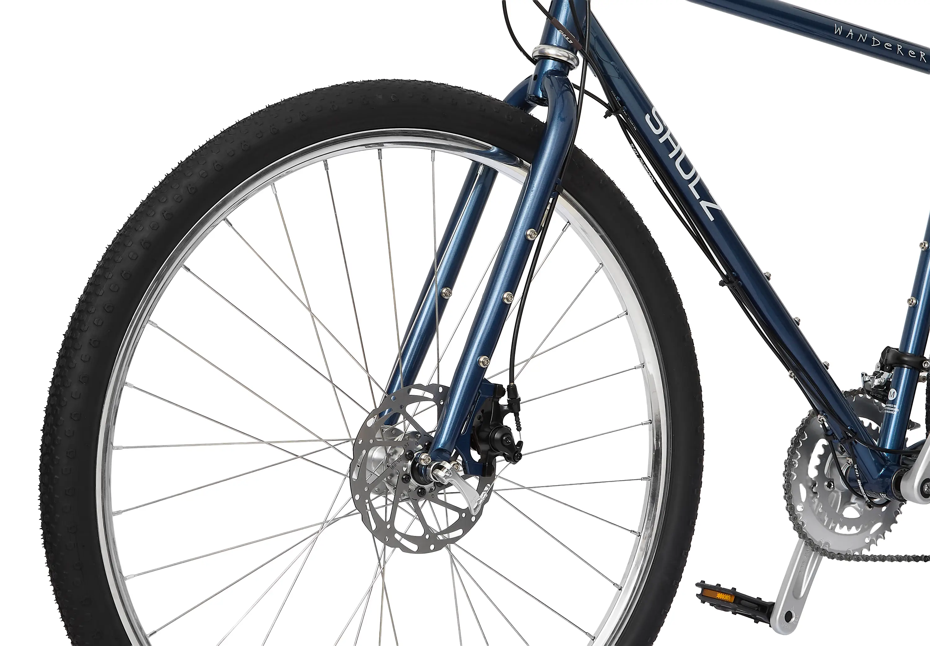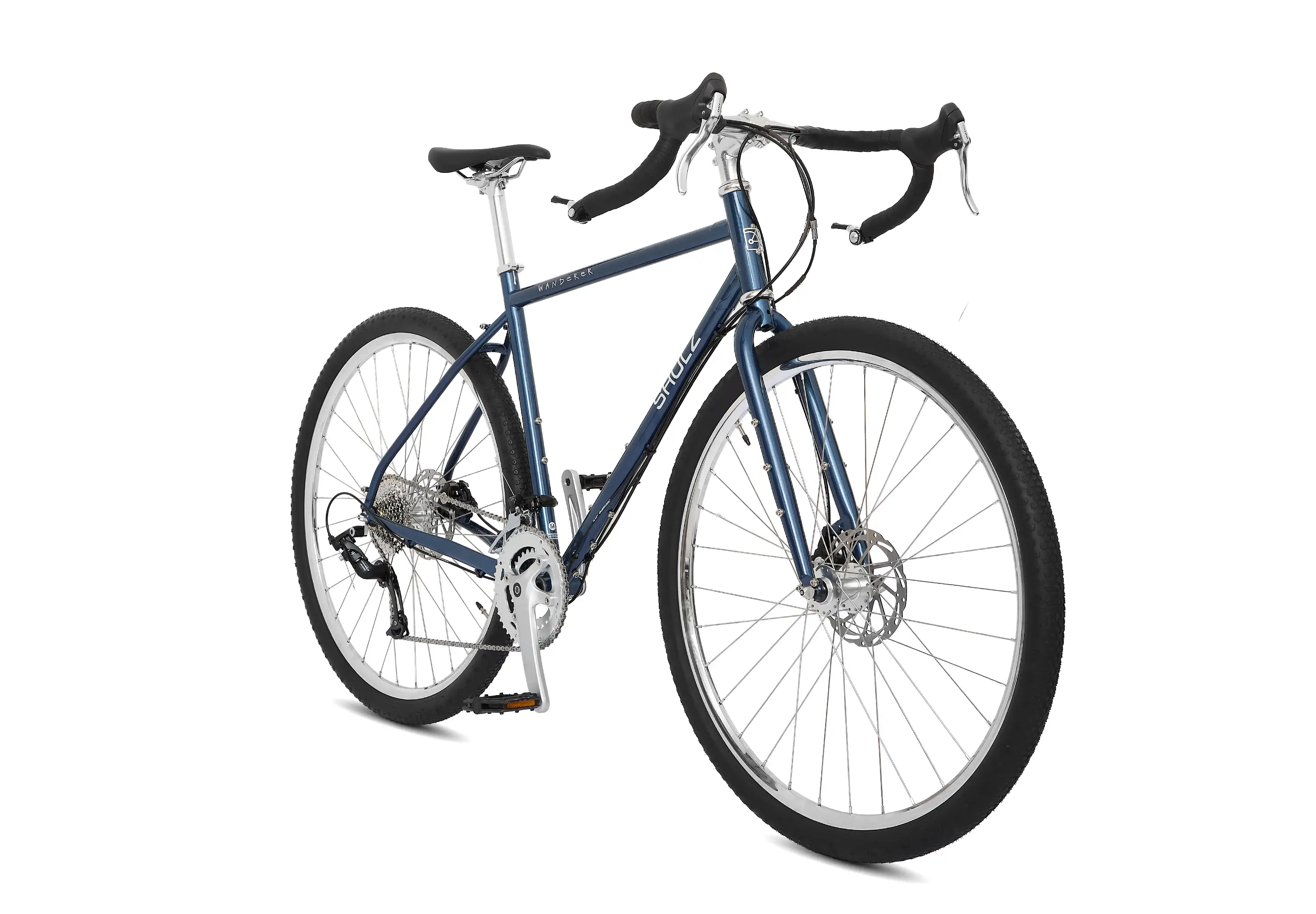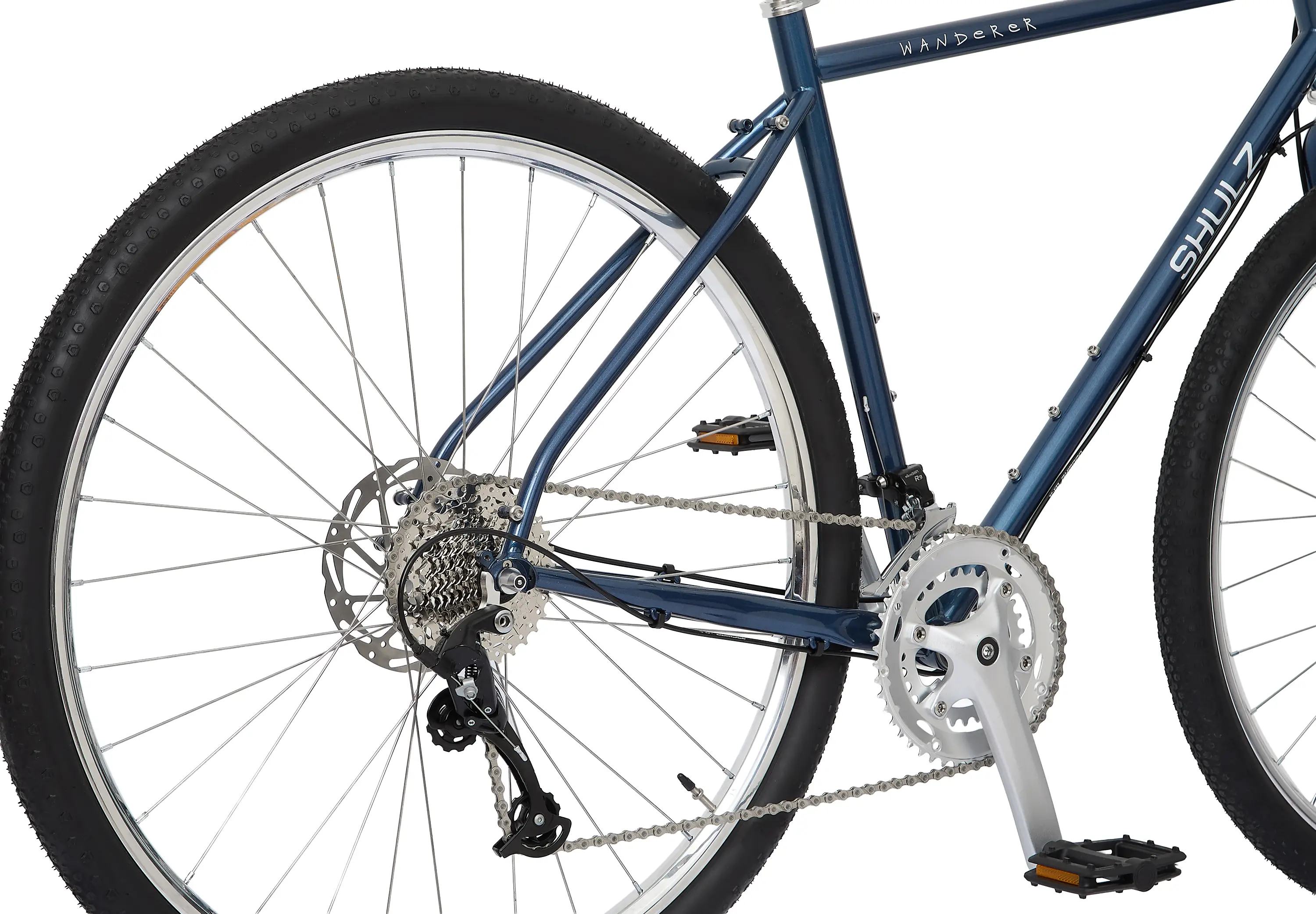 Shulz Wanderer — это хроммолибденовый грэвел-байк на колесах 28″, с дисковыми тормозами, рулем-бараном и разнообразными креплениями на раме, чтобы возить любые грузы. Можете использовать его как повседневный городской велосипед, как велосипед для похода выходного дня или для серьезных длительных поездок с грузом на багажнике.