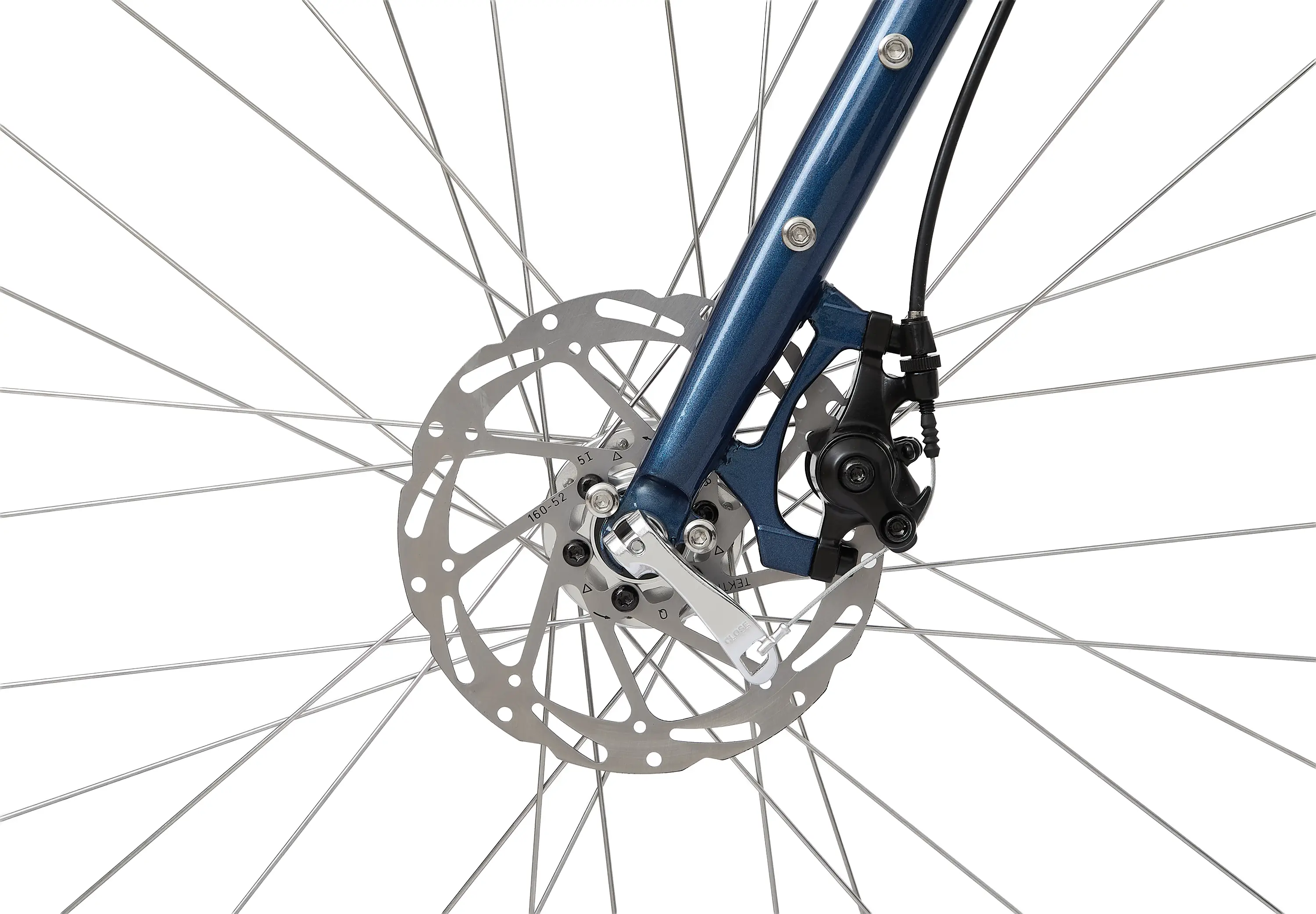 Задний тормоз крепится стандартным пост-маунт на нижнем пере под 160-й диск, на раме алюминиевый сменный держатель заднего переключателя и стандартный подседельный штырь 27,2 мм. Высота вилки 420 мм, есть резьбовые отверстия под переднее крыло и багажник, на внешней стороне ноги есть отверстия под флягодержатель, либо рамку для груза, на внутренней стороне ноги есть еще одно отверстие — на случай, если вы вдруг решите установить передний багажник, что-то вроде Tubus Duo. У вилки прямой шток диаметром 1⅛ дюйма.