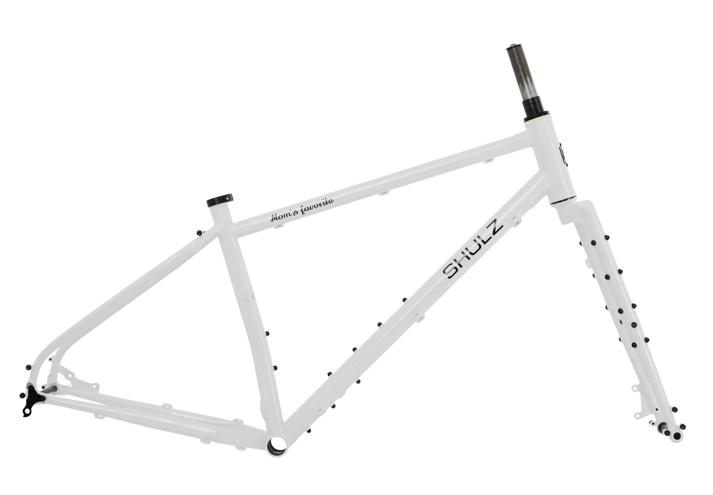 Рама и вилка велосипеда SHULZ Mom’s Favorite в двух размерах. Трубы CrMo 4130, порошковая покраска и антикоррозийная обработка внутри рамы. В комплекте передняя и задняя оси, рулевая колонка NECO на промподшипниках, подседельный зажим, крепежные болты для флягодержателей и держатель заднего переключателя. Возможна установка покрышек максимум 27,5×3,0 или 29×2,5.