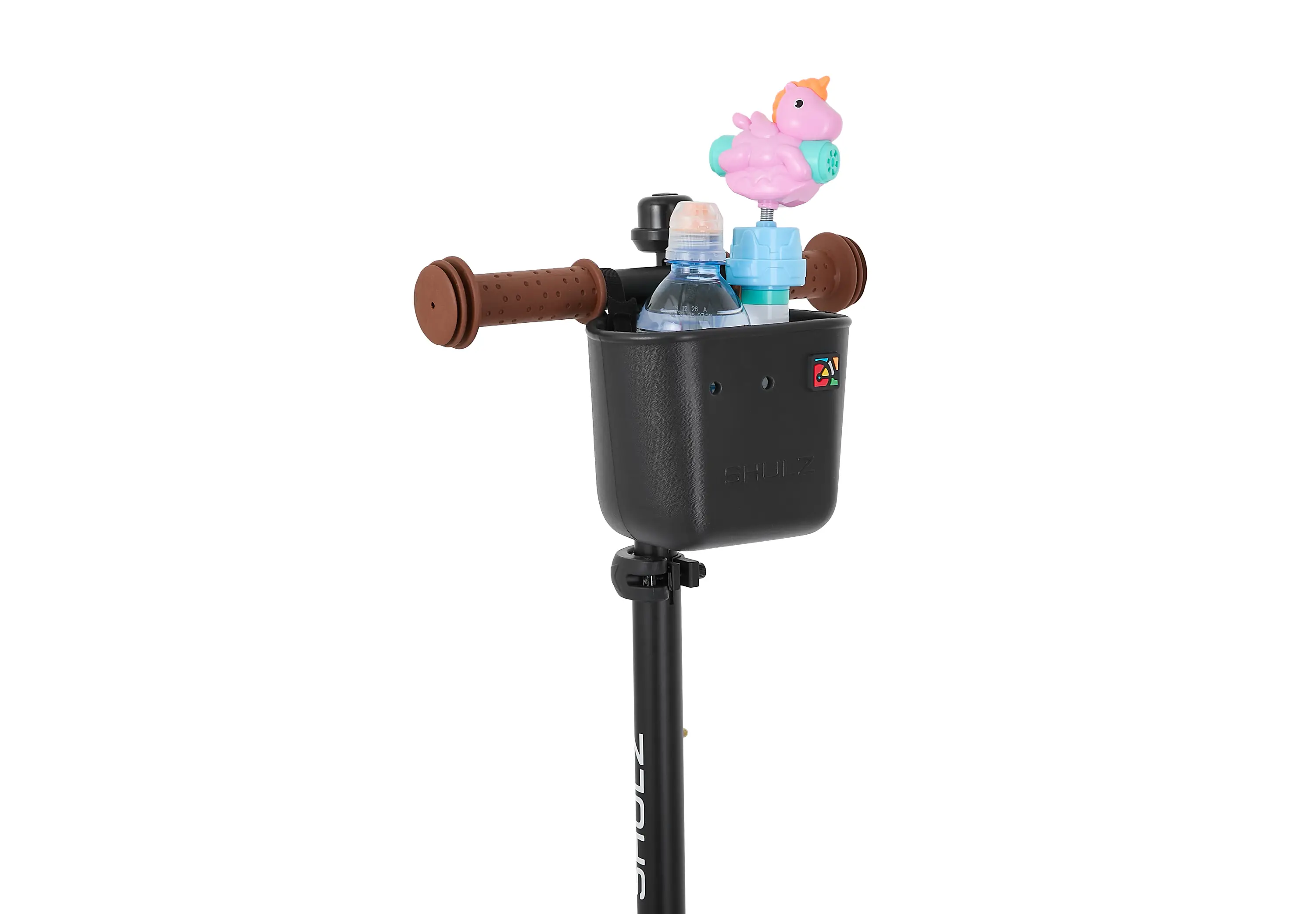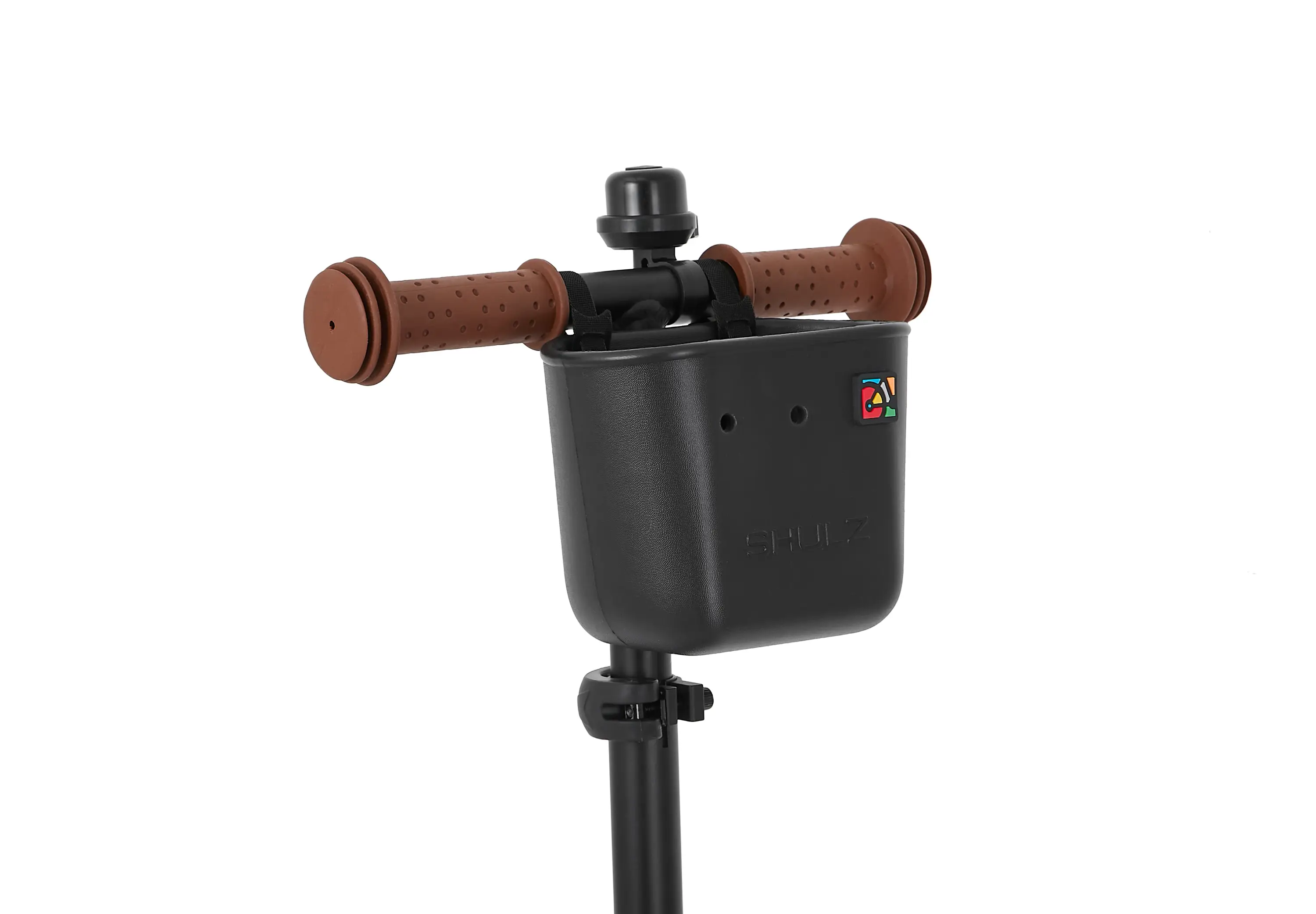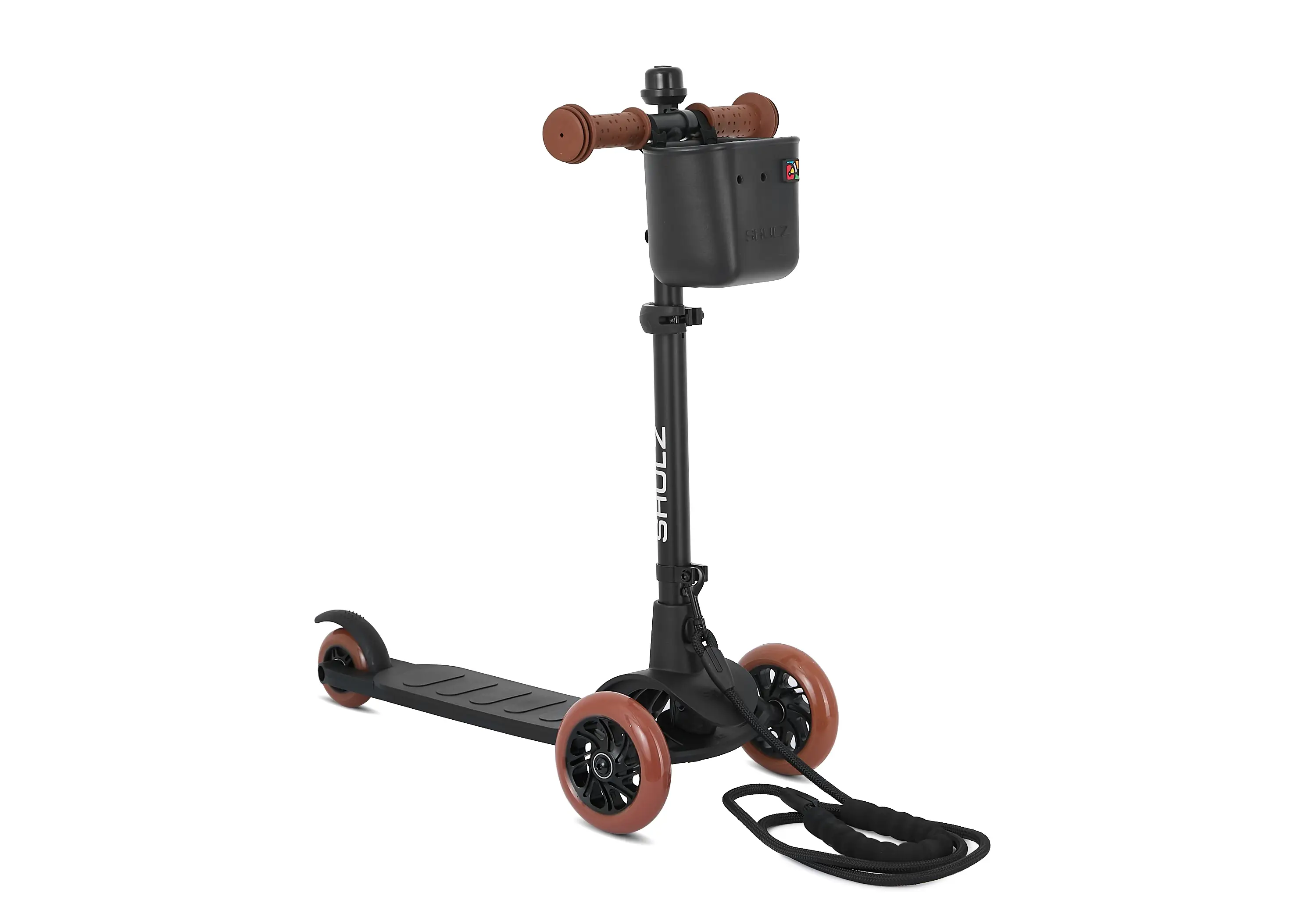 Но красота кроется в деталях, поэтому в комплекте с каждым самокатом идёт корзинка SHULZ EVA, симпатичный звоночек, набор ярких наклеек и наша особенная фишка — быстросъемный шнур-буксир! Да-да, шнур-буксир на случай, когда юный исследователь устал. Буксир крепится к основанию руля с помощью быстросъемного карабина.