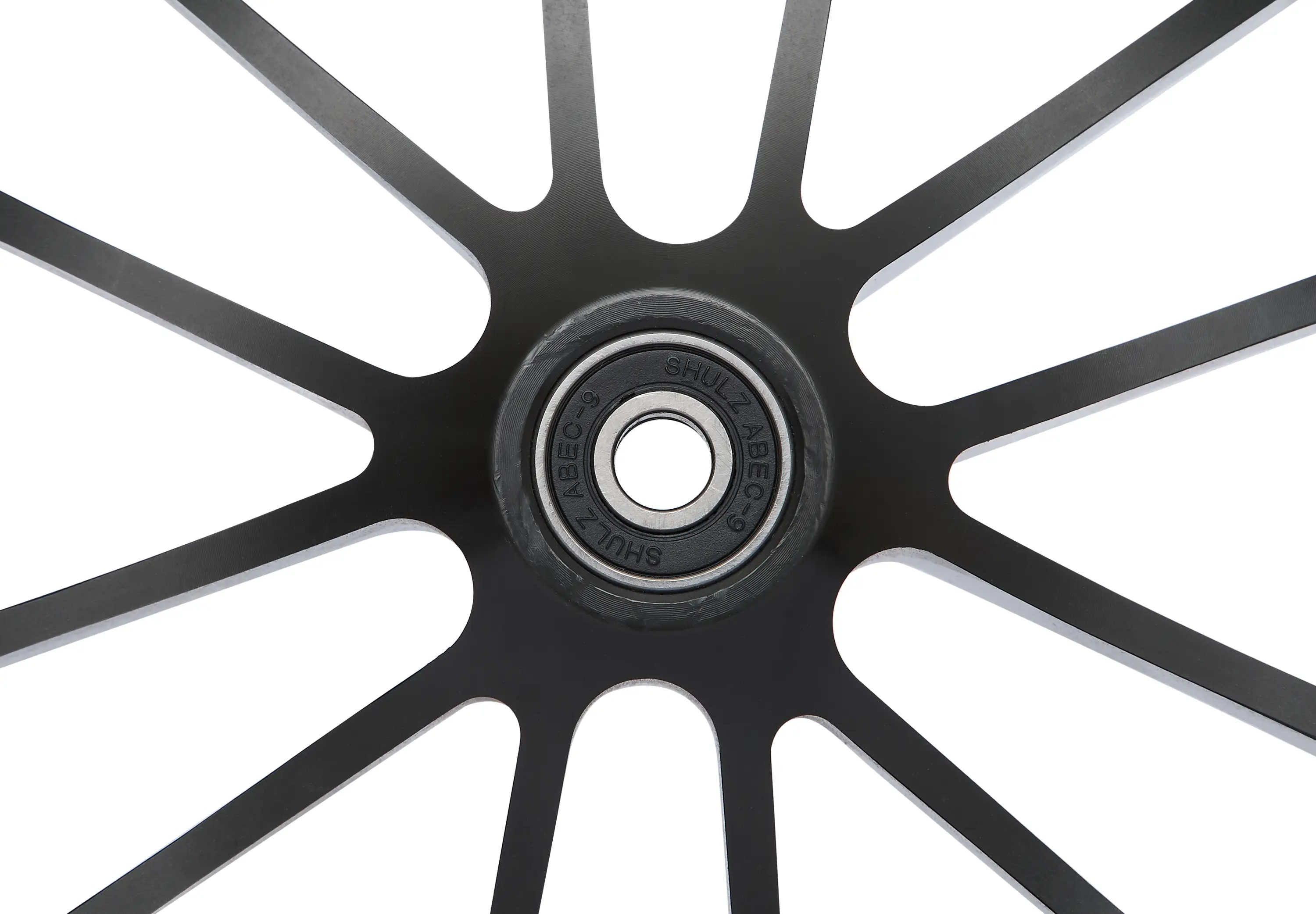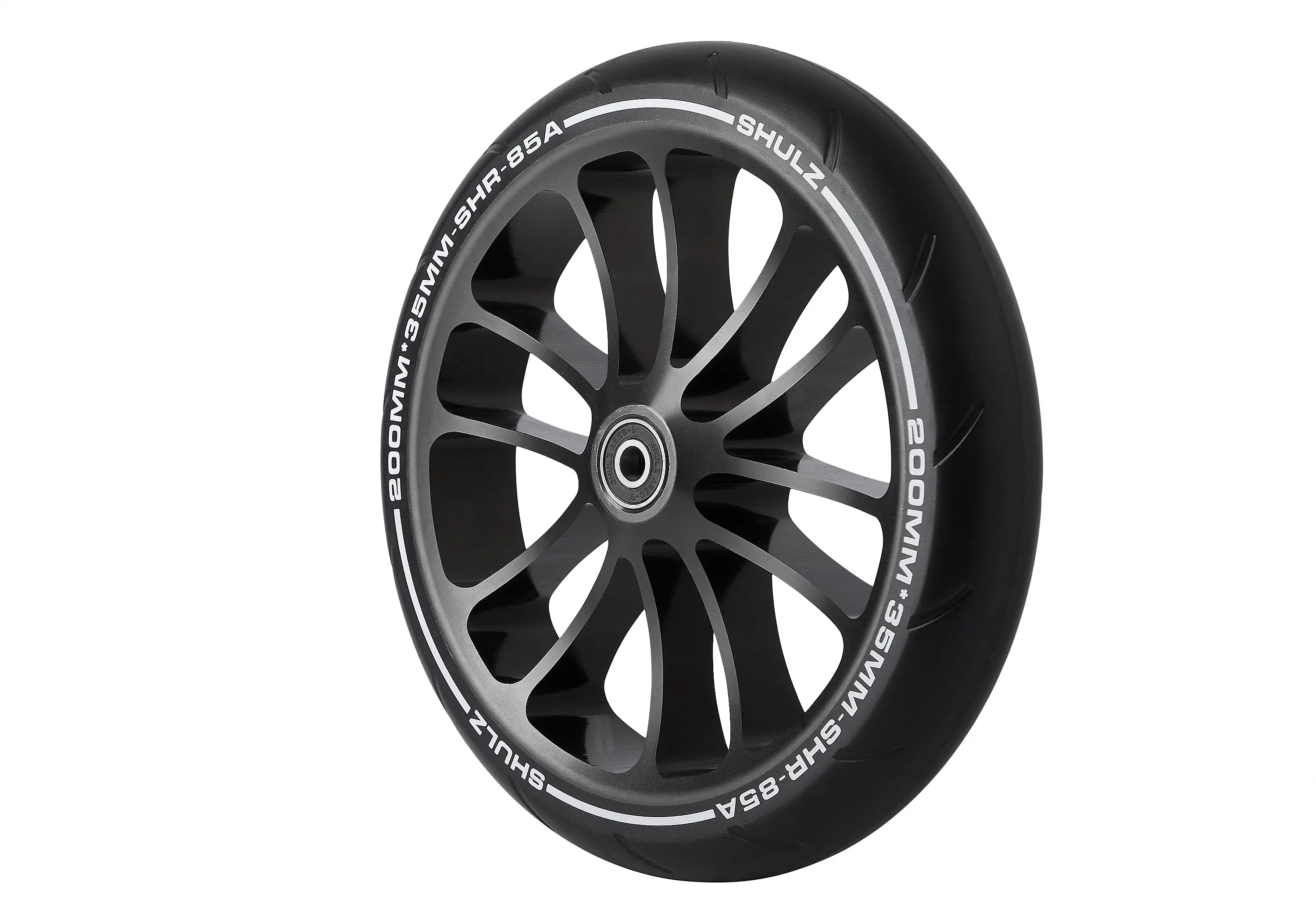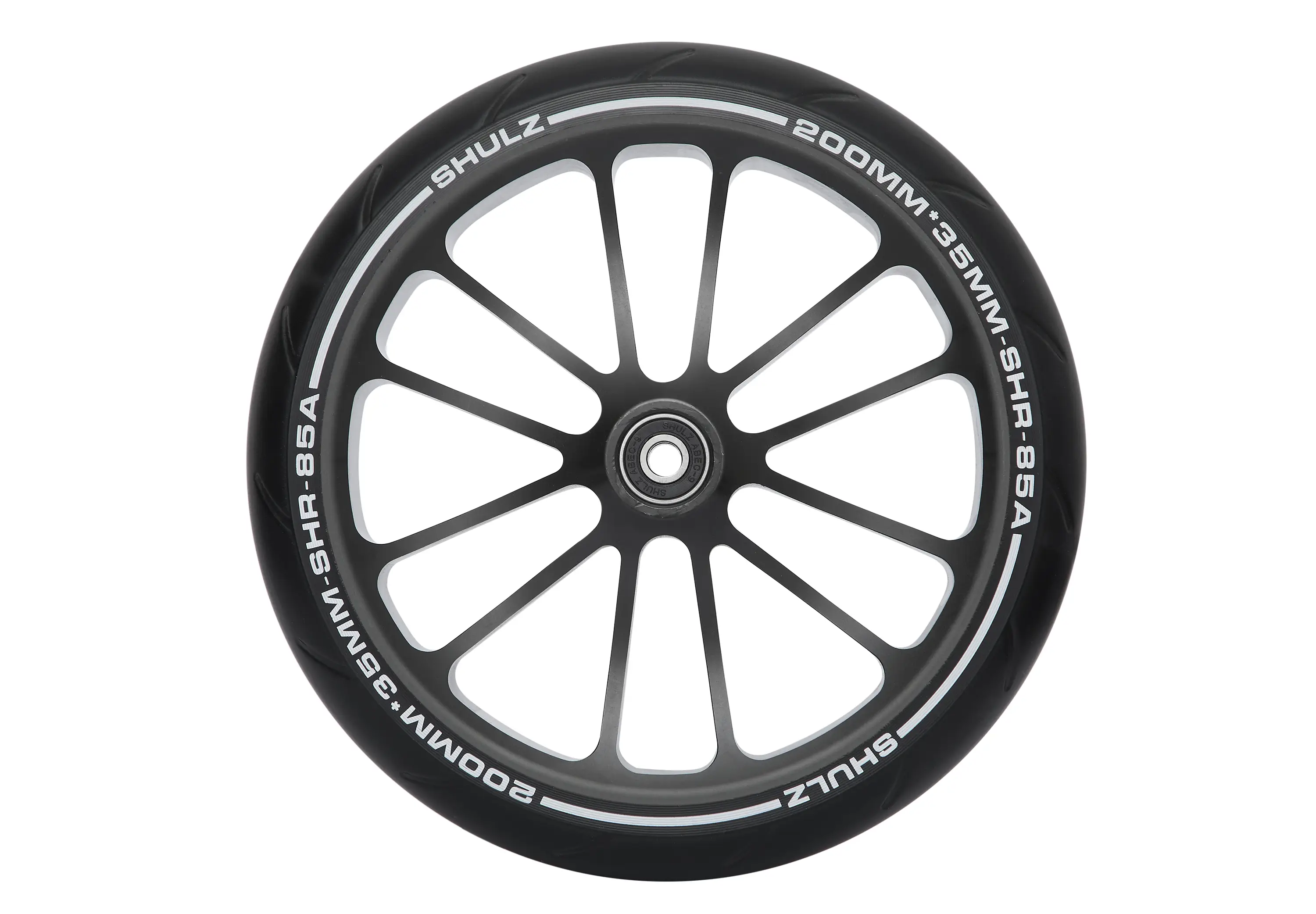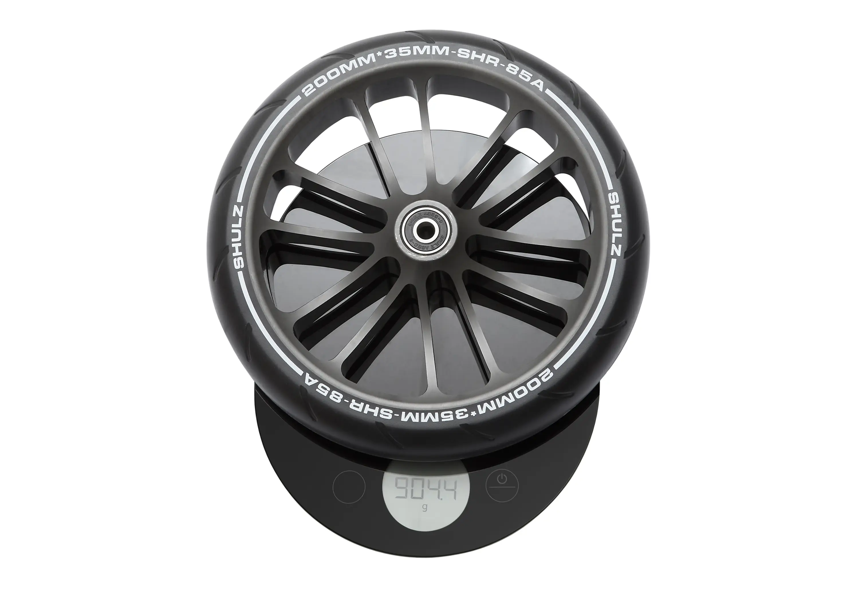 Фрезерованные вручную алюминиевые колеса Shulz диаметром 200 мм оценят опытные райдеры, которые любят скорость и абсолютную управляемость. Эти колеса тяжелее стандартных полиуретановых, что позволяет опустить центр тяжести самоката, за счет чего управление становится более плавным и ровным. Лучше проявят себя на хороших дорогах, однако и с небольшими неровностями справляются отлично.